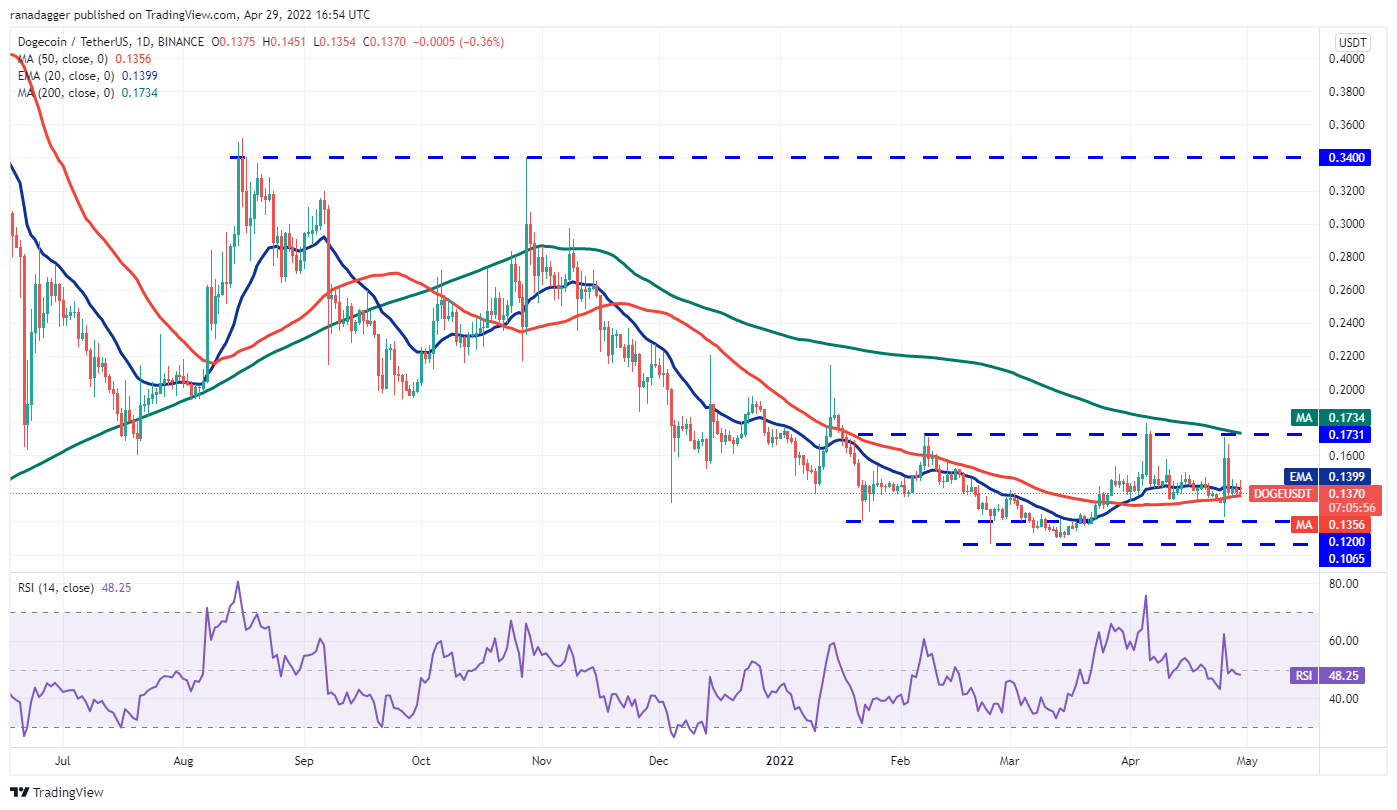 Dogecoin (DOGE) has managed to stay above the 50-day SMA ($0.13) for the past three days but the bulls have not been able to sustain the price above the 20-day EMA ($0.14). This suggests that the bears are selling at higher levels.