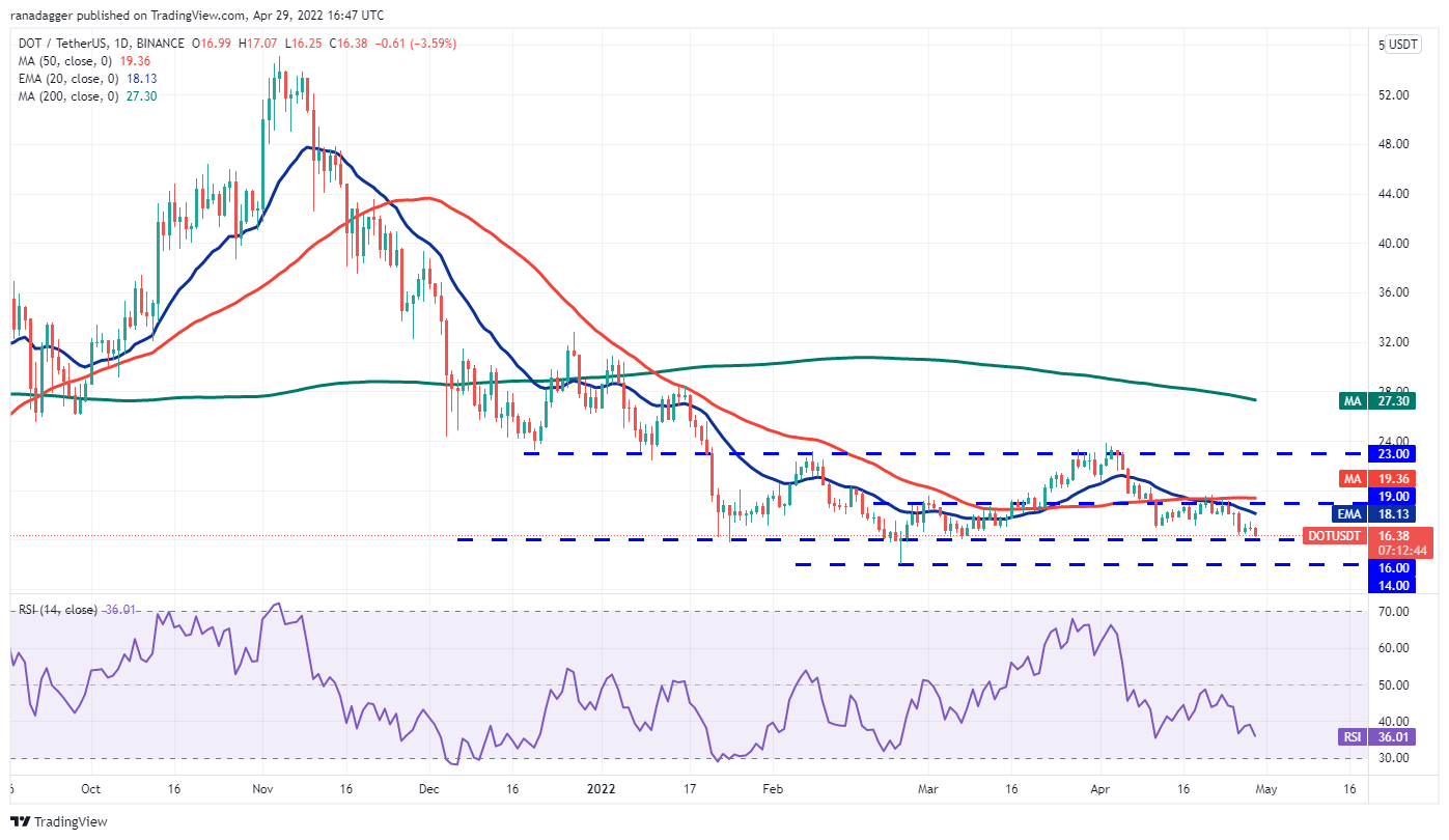 The downsloping 20-day EMA ($18) and the RSI in the negative territory indicate advantage to sellers. The bears will now attempt to pull the price below the $16 support and if they manage to do that, the DOT/USDT pair may drop to $14.