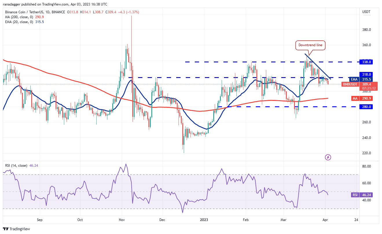 The 20-day EMA ($315) is flattish and the RSI is just below the midpoint, indicating a balance between supply and demand. This balance will tilt in favor of the bears if the price breaks below $306.The BNB/USDT pair could then dive to the 200-day SMA ($290).
