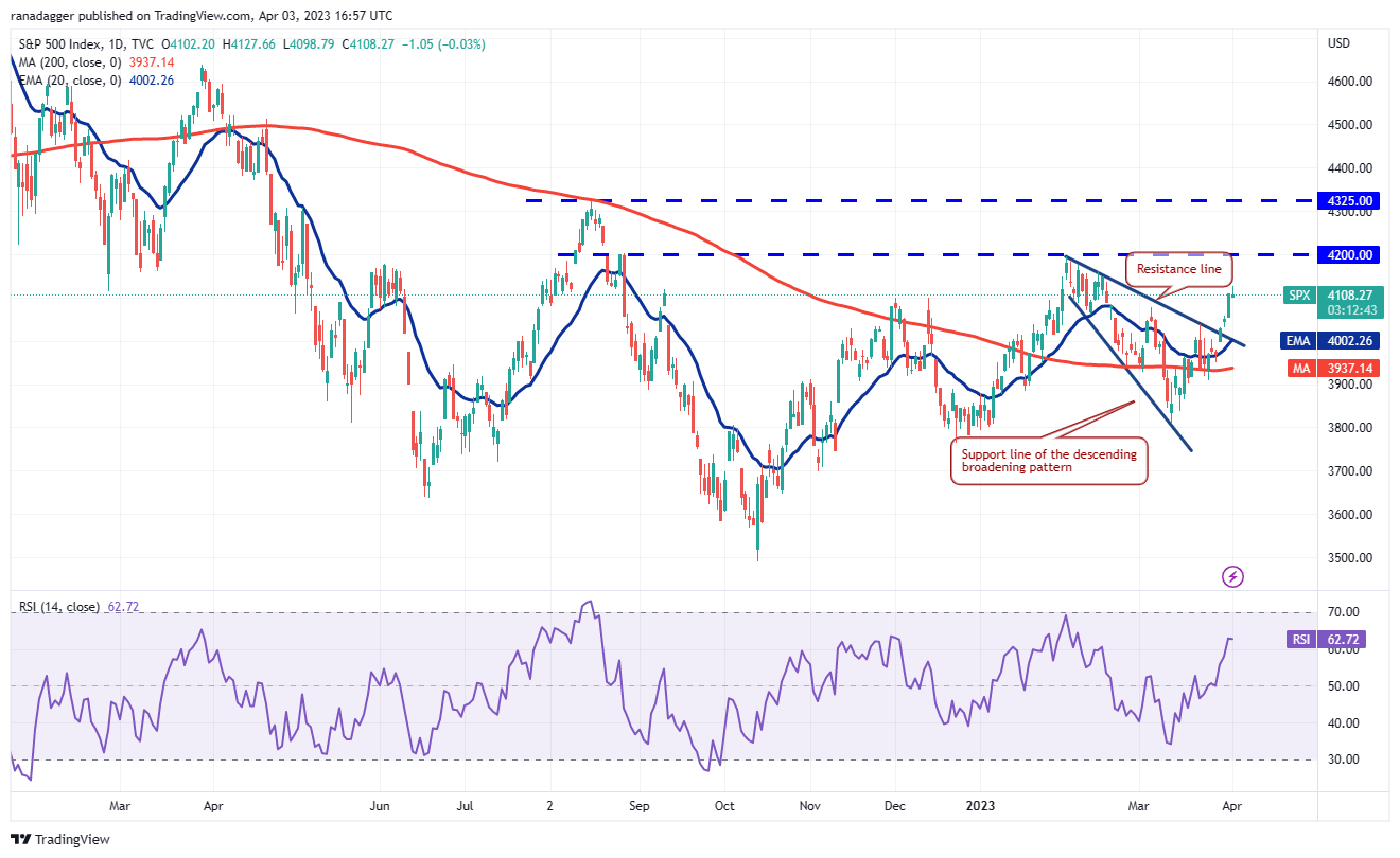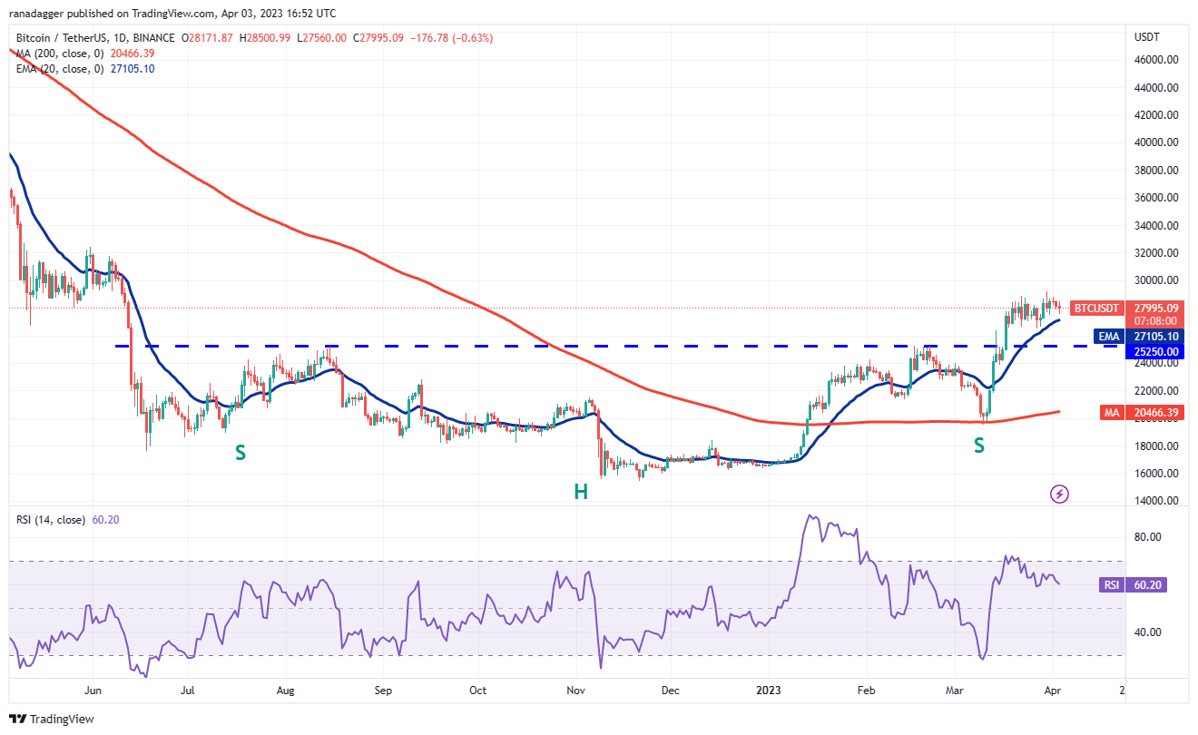 The bears could not even pull Bitcoin to the 20-day EMA ($27,105) on April 3, suggesting that the bulls are buying the intraday dips.