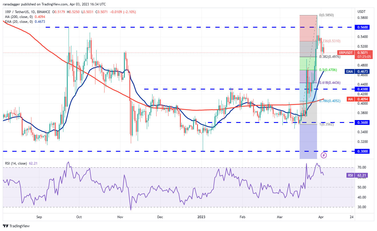 Buyers are trying to arrest XRP’s (XRP) correction near the 38.2% Fibonacci retracement level of $0.49 while the bears are attempting to sink the price below it.