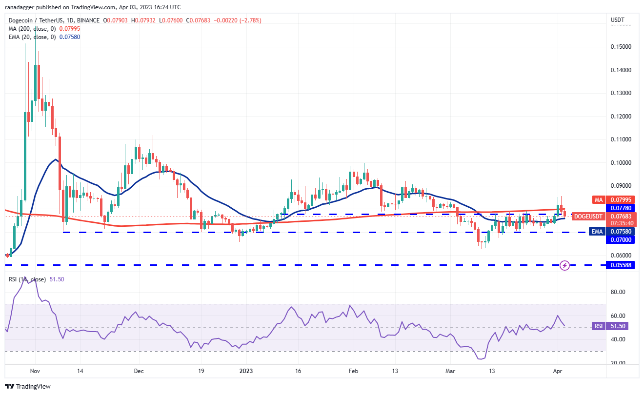 Dogecoin (DOGE) climbed above the 200-day SMA ($0.08) on April 1 but the bulls could not sustain the higher levels. The bears sold aggressively and pulled the price back below the 200-day SMA on April 2.