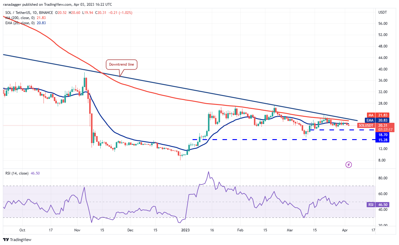 Solana (SOL) continues to trade near the 20-day EMA ($20.83), indicating that both the bulls and the bears are not waging large bets.