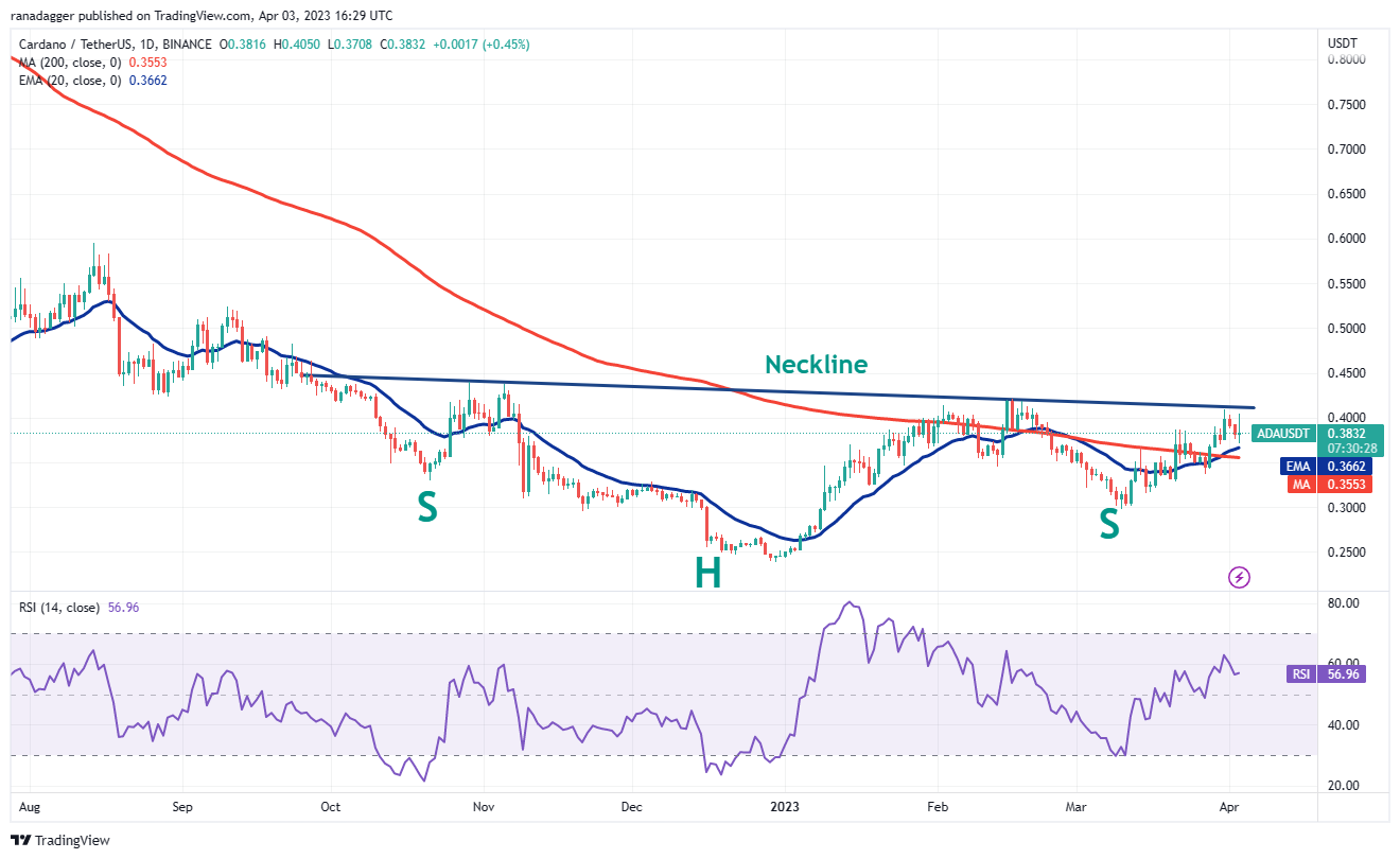 Cardano (ADA) rebounded off the 20-day EMA ($0.36) on April 3, indicating a change in sentiment from selling on rallies to buying on dips.