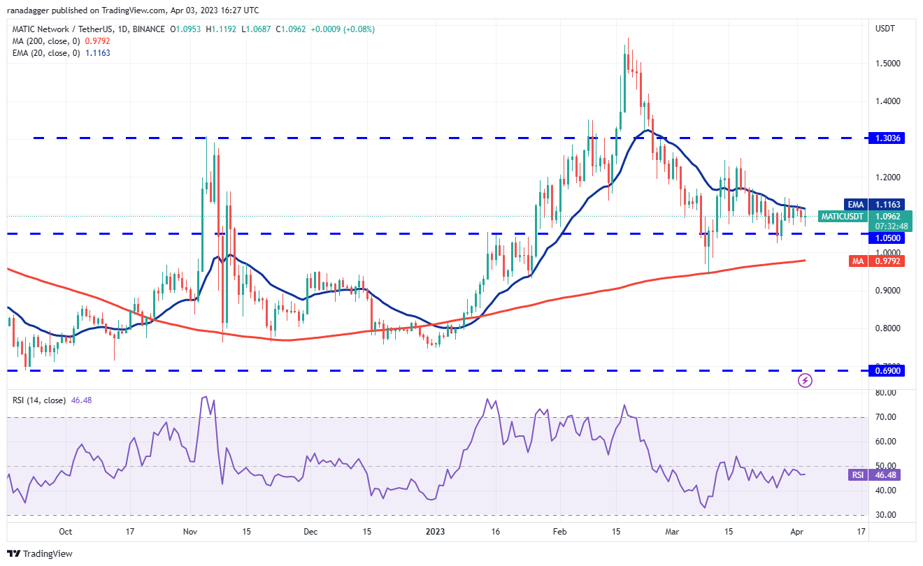 The 20-day EMA is flattening out and the RSI is just below the midpoint, indicating that the selling pressure is reducing. If buyers propel the price above the $1.15 resistance, the MATIC/USDT pair could rally to the overhead resistance zone between $1.25 and $1.30.