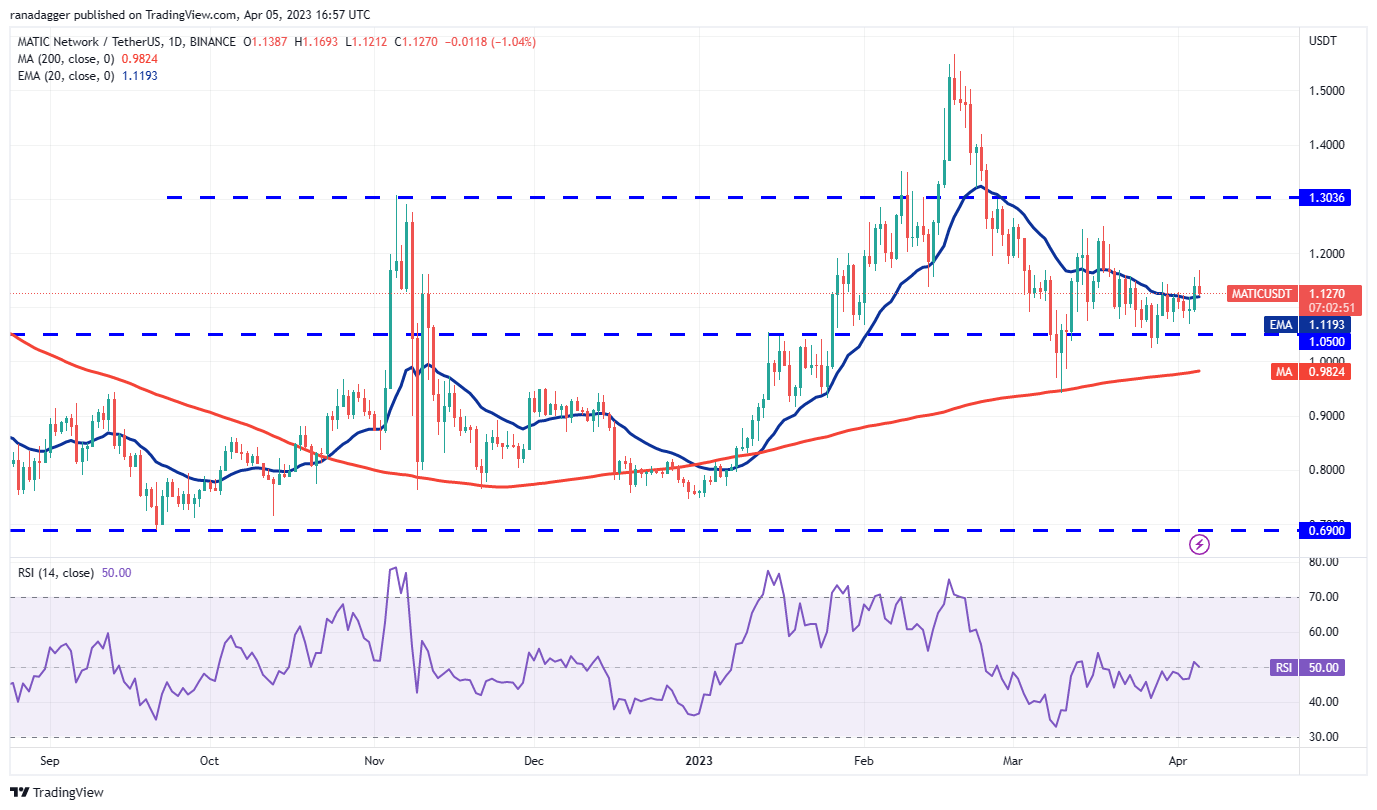 Polygon’s (MATIC) tight consolidation near the 20-day EMA ($1.11) resolved to the upside on April 4 but the bulls are struggling to build upon this advantage.