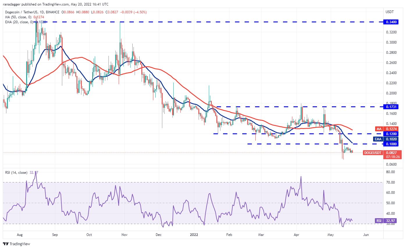 Dogecoin (DOGE) bounced off the immediate support at $0.08 on May 18 but the recovery continues to face selling at higher levels. This suggests that the sentiment remains negative and traders are selling on every minor rise.