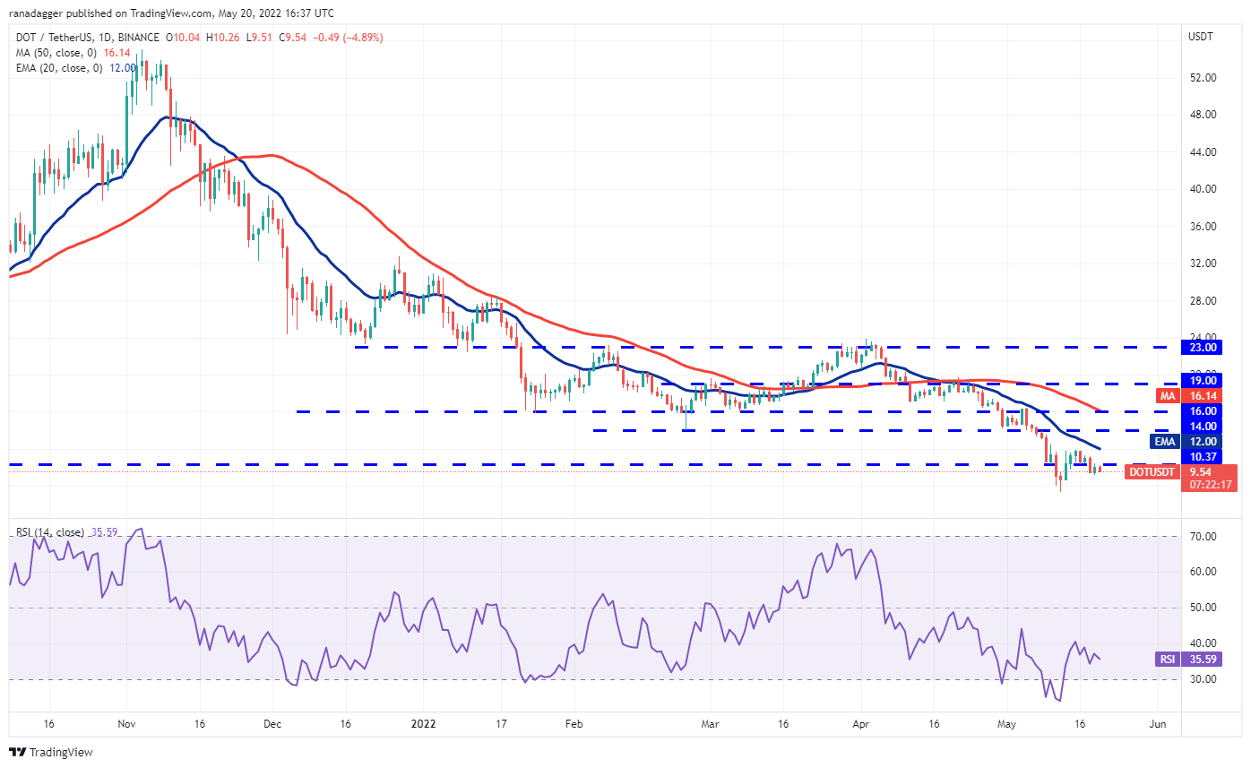 Polkadot (DOT) slipped below $10.37 on May 18 but the bulls purchased this dip and tried to push the price back above the level on May 19. However, the bears stood their ground and are attempting to flip $10.37 into resistance.