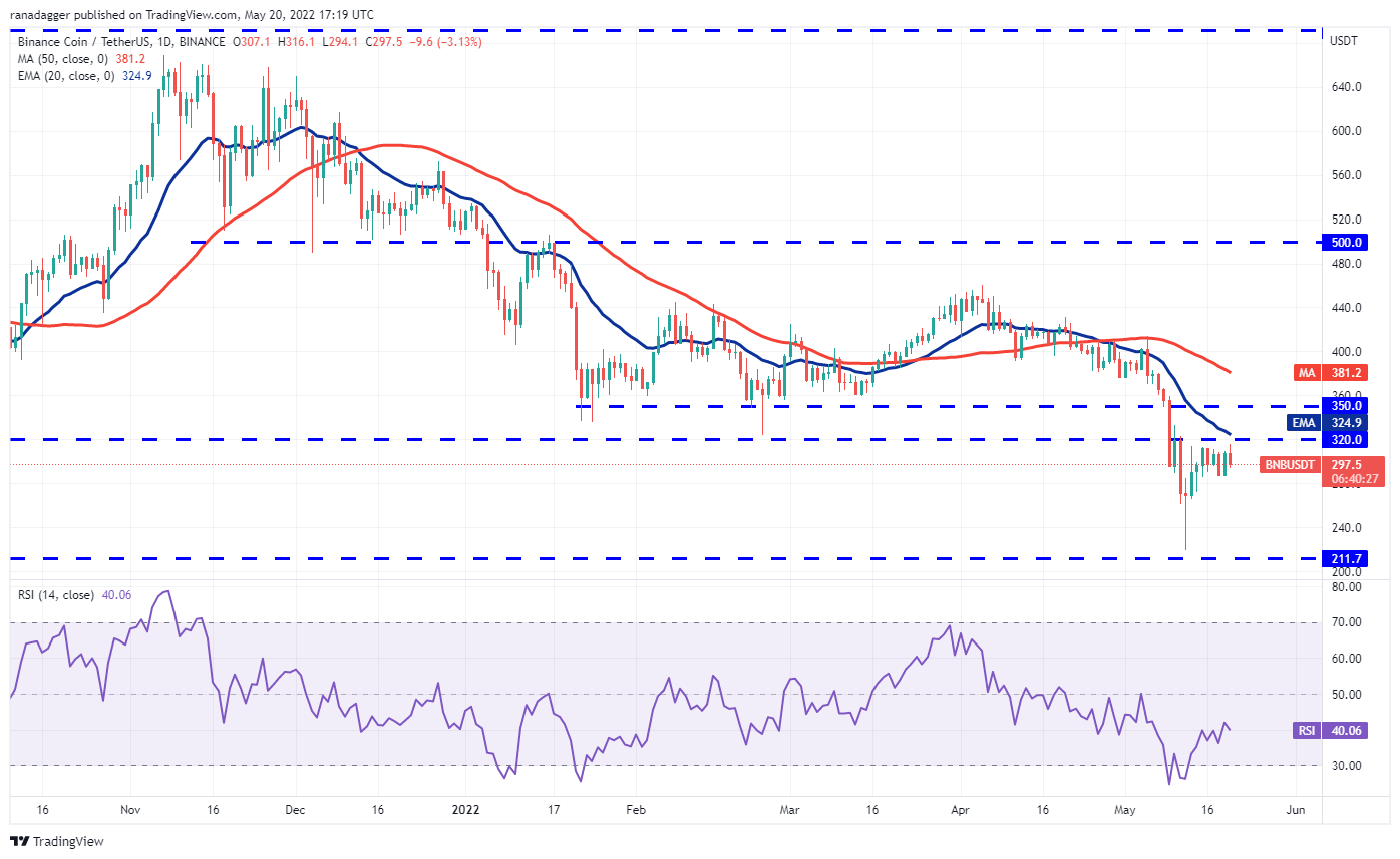 If bulls thrust the price above the overhead resistance zone between $320 and the 20-day EMA ($326), it will suggest that the BNB/USDT pair may have bottomed out. The pair could then start its northward journey toward the 50-day simple moving average (SMA) ($381).