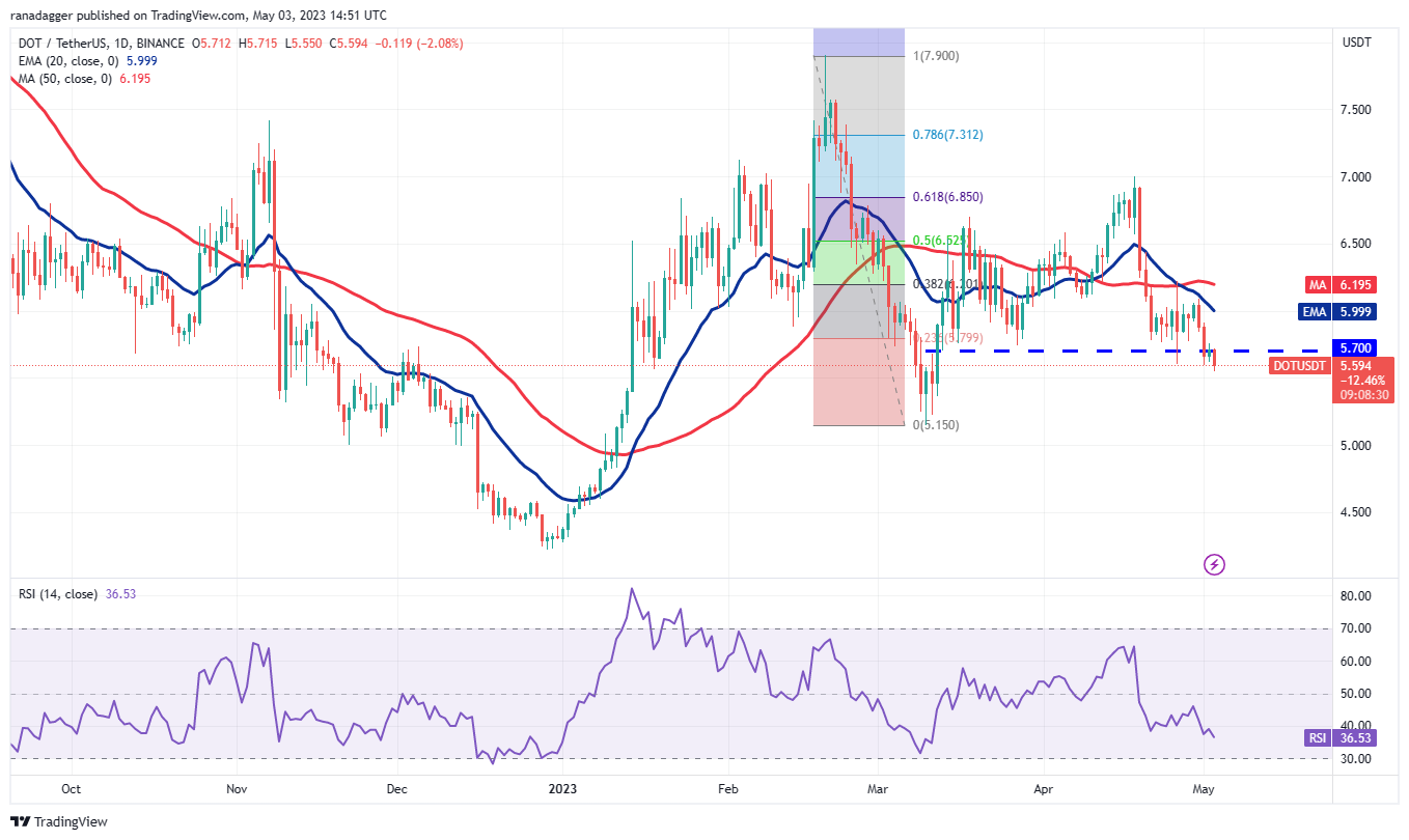 Polkadot (DOT) slipped below the $5.70 support on May 1 and the bears are trying to build upon this advantage on May 3.