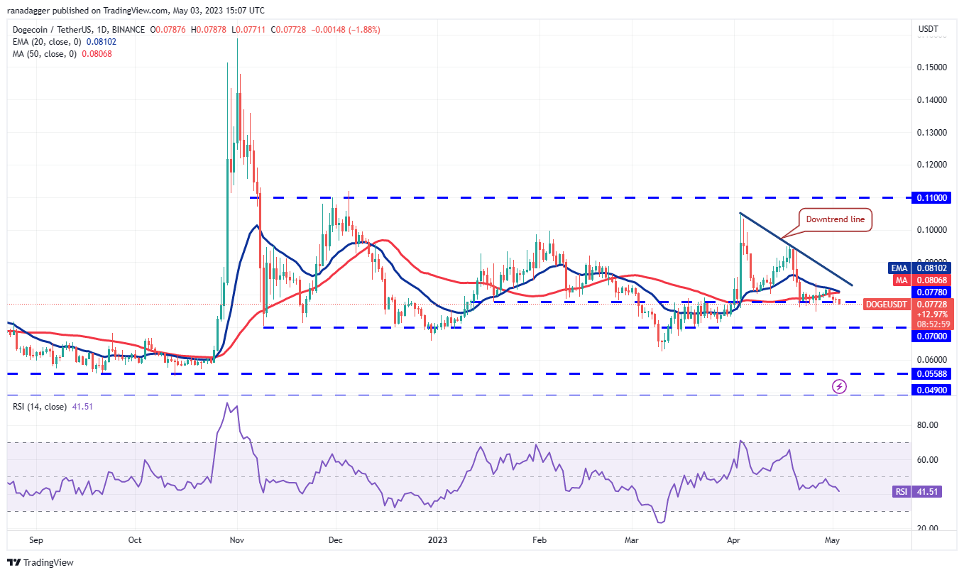 Dogecoin (DOGE) is struggling to bounce off the strong support near $0.08, which suggests a lack of demand from the bulls.