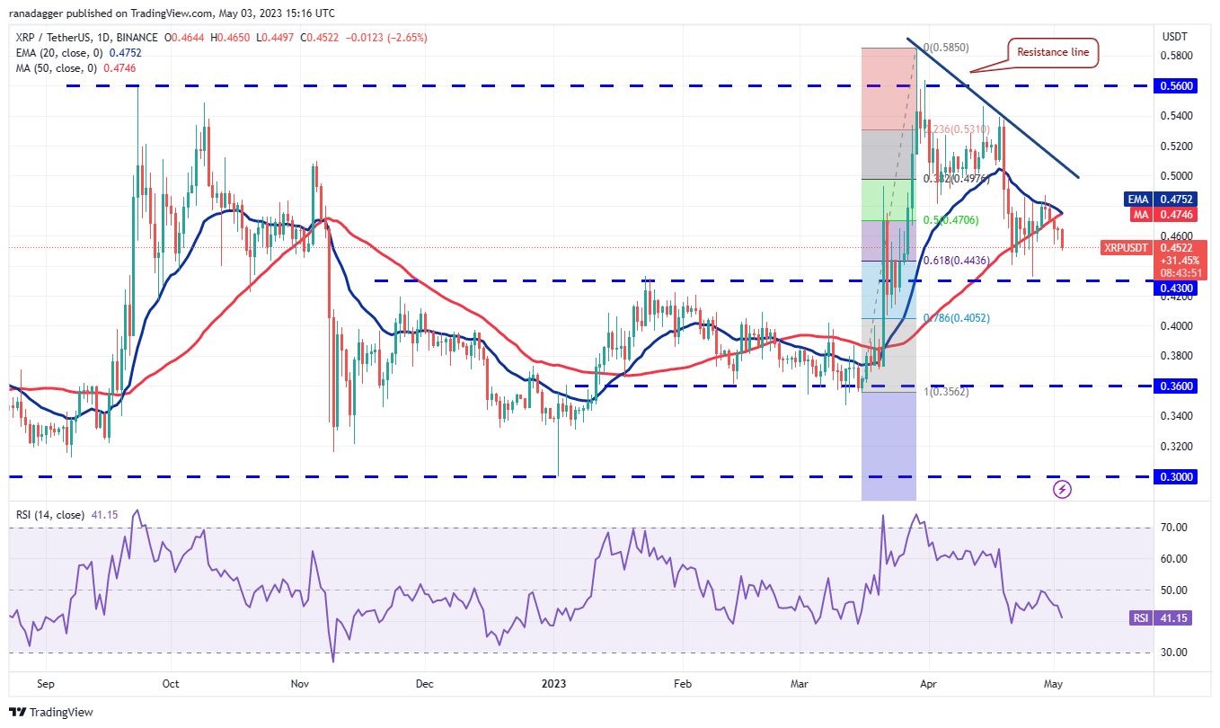 The bears will try to extend the decline to the strong support at $0.43. This remains the key level to watch for in the near term. If this support crumbles, the XRP/USDT pair may drop to $0.36. This level is likely to attract aggressive buying by the bulls.