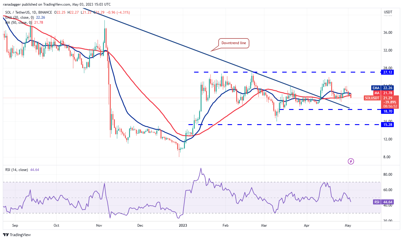 Buyers defended the 50-day SMA ($21.78) on May 2 but they could not propel Solana (SOL) above the 20-day EMA ($22.26). This shows that the bears are selling on every minor rally.