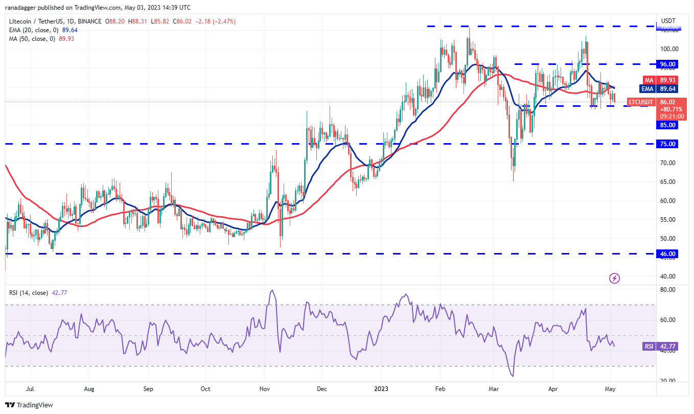 Litecoin (LTC) is getting squeezed between the 20-day EMA ($89) and the horizontal support at $85. The moving averages have completed a bearish crossover and the RSI is in the negative zone, indicating that bears hold the edge.