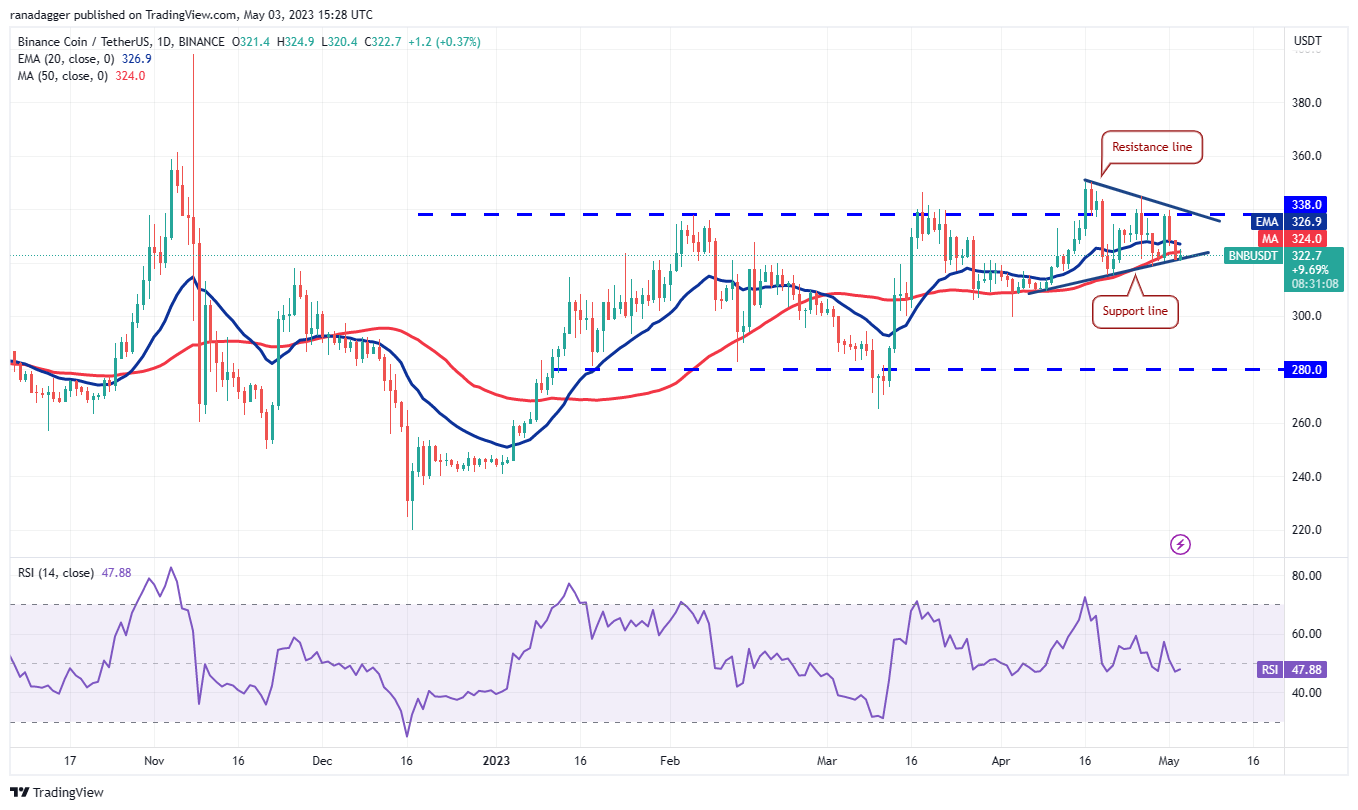 Buyers are trying to guard the support line of the triangle. If they manage to push the price above the 20-day EMA ($326), the BNB/USDT pair could rise to the resistance line. Traders will have to overcome this obstacle to signal the start of a new up-move.