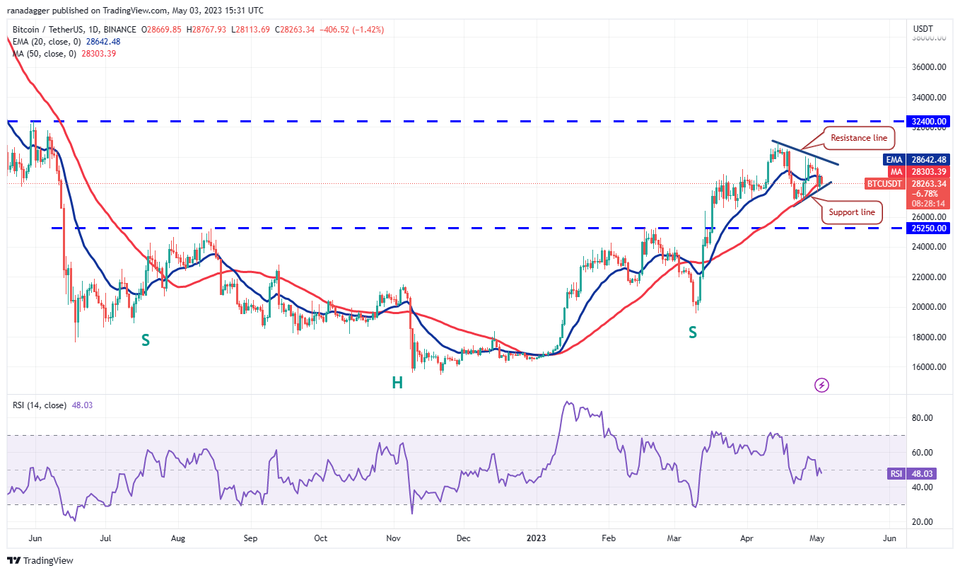 The flattish 20-day exponential moving average ($28,642) and the relative strength index (RSI) near the midpoint do not give a clear advantage either to the bulls or the bears.