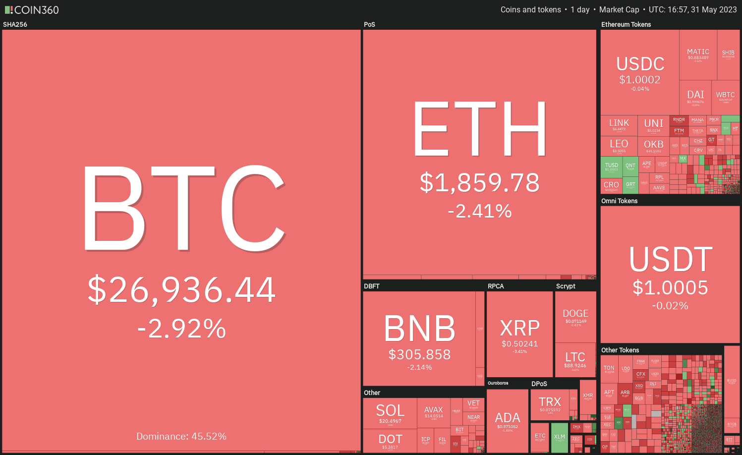 https://images.cointelegraph.com/cdn-cgi/image/format=auto,onerror=redirect,quality=90,width=840/https://s3.cointelegraph.com/uploads/2023-05/391b724f-4b3b-4d0b-b8b4-f8bf6c4be031.jpgBitcoin and most major altcoins are struggling to hold on to their higher levels, indicating that the bears have not given up yet.