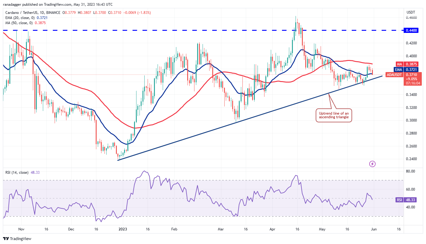 Cardano (ADA) turned down from the 50-day SMA ($0.38) on May 29, indicating that the bears are protecting this level aggressively.