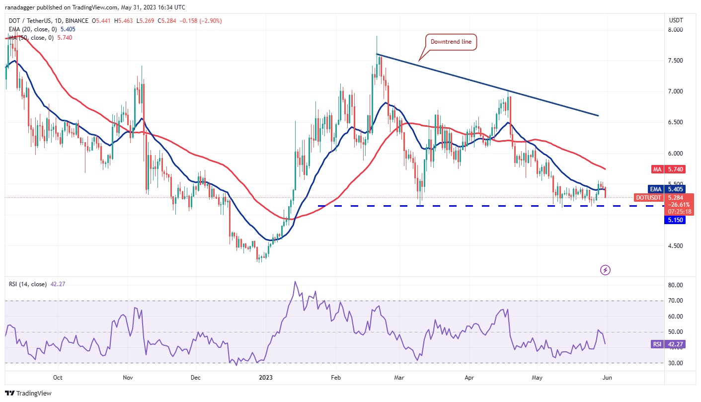 The bulls pushed Polkadot (DOT) above the 20-day EMA ($5.40) on May 28 but they could not build upon this breakout. This shows that demand dries up at higher levels.