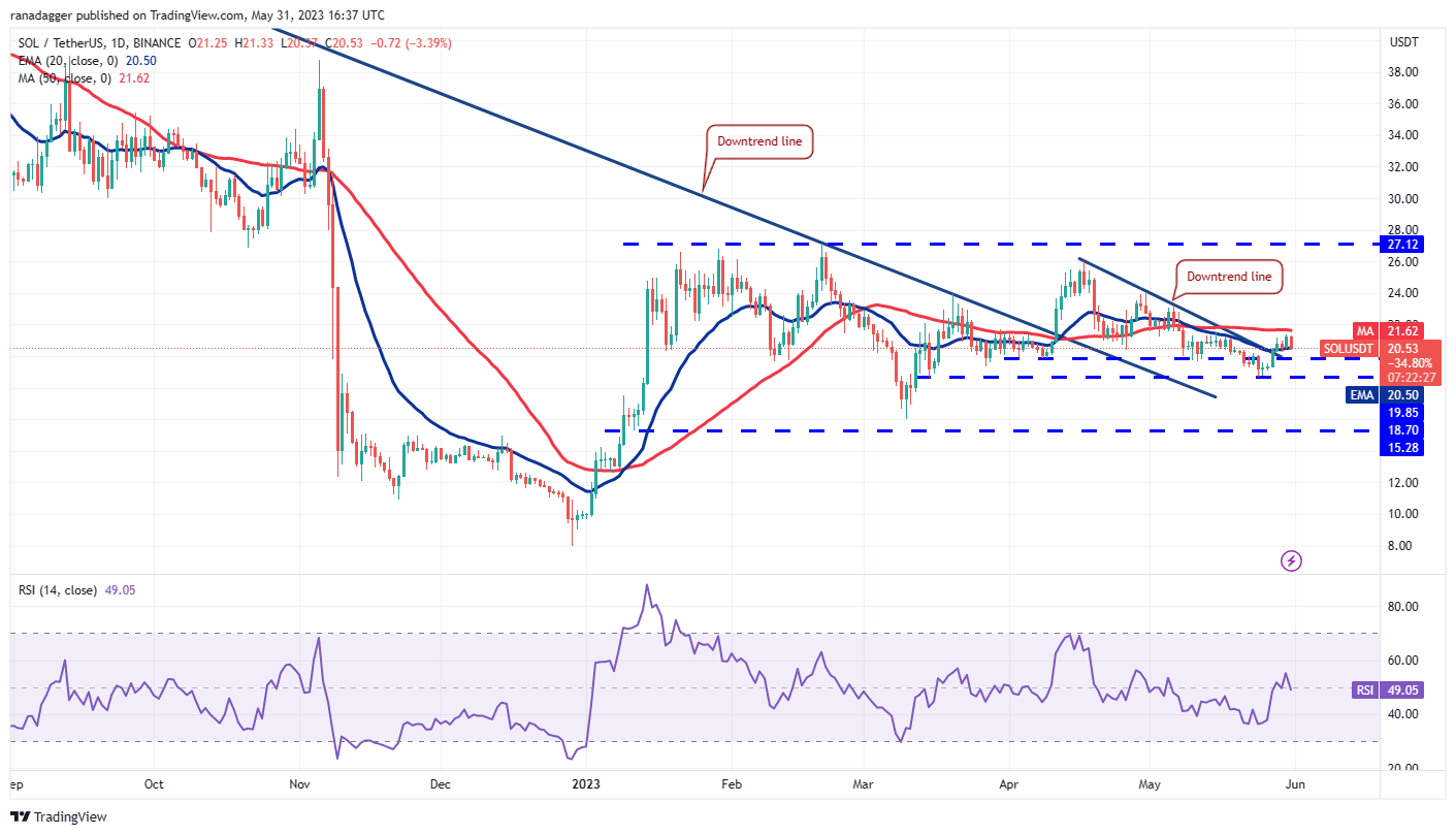 The 20-day EMA is flattish and the RSI is near the midpoint, indicating a range-bound action in the near term. If the price dips below the 20-day EMA, the SOL/USDT pair could slide to the solid support at $18.70. A bounce off this level will suggest a consolidation between $18.70 and the 50-day SMA.