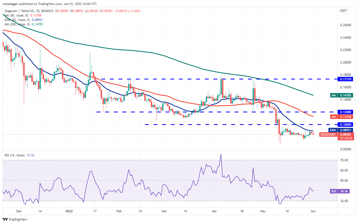Dogecoin’s (DOGE) price has been trading near the 20-day EMA ($0.09) for the past two days but the bulls have failed to achieve a breakout. This suggests that bears are defending the 20-day EMA with vigor.