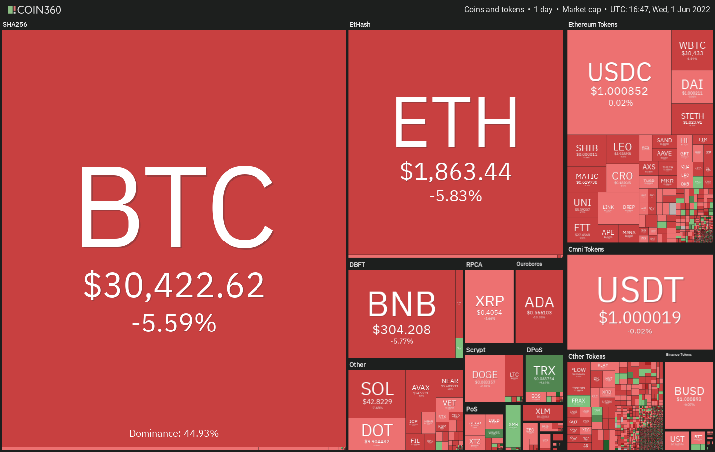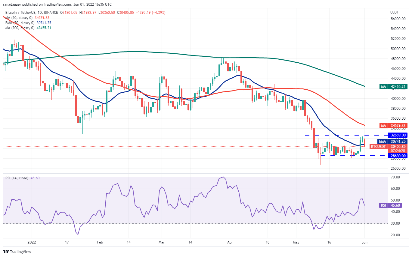 This uncertainty resolved in favor of the bears on June 1 and they pulled the price below the 20-day exponential moving average (EMA) ($30,741). If the price sustains below the 20-day EMA, the next stop could be $28,630. The buyers are expected to defend this level with all their might.