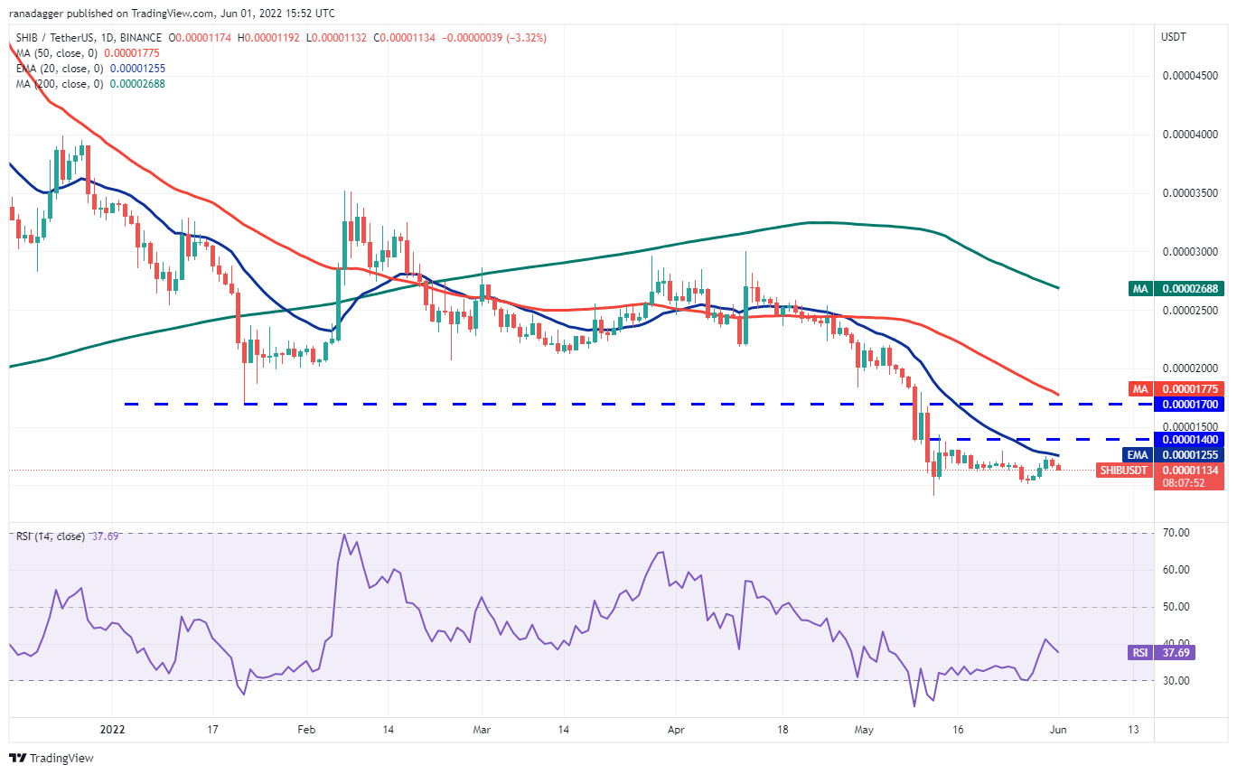 Shiba Inu’s (SHIB) recovery is facing stiff resistance at the 20-day EMA ($0.000012), suggesting that the sentiment remains negative and bears are selling on rallies.