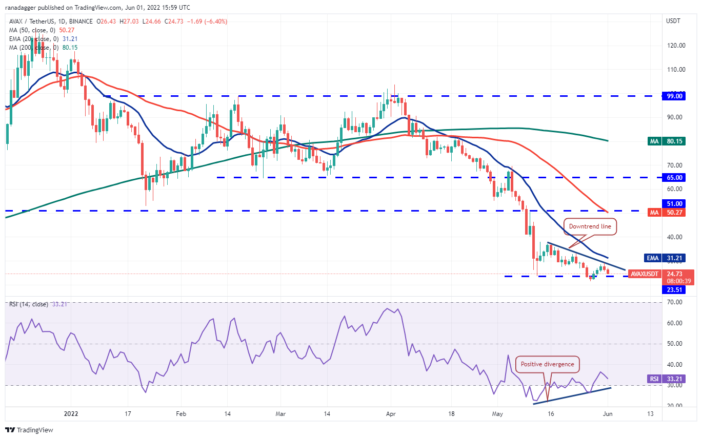 Avalanche (AVAX) turned down from the downtrend line on May 31, suggesting that bears continue to defend the level with vigor. The bears will now try to pull the price below the strong support zone of $23.51 to $21.35.