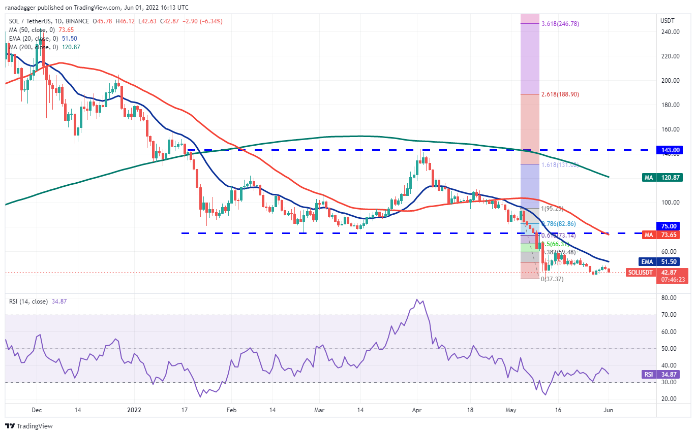 The bears will try to pull the price to the strong support at $40. The bulls are expected to buy the dips to this level. If the price rebounds off this support, the buyers will again try to push the SOL/USDT pair above the 20-day EMA ($51). If they succeed, the pair could rally to $60 and thereafter attempt an up-move to the breakdown level of $75.
