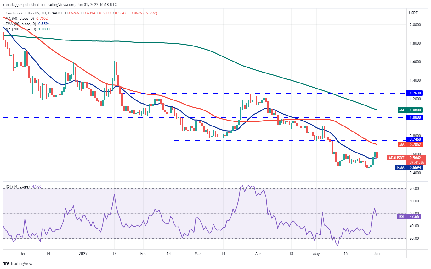 Cardano (ADA) broke above the 20-day EMA ($0.56) on May 30 and followed it up with another sharp up-move on May 31. This pushed the price to the 50-day SMA ($0.70) but the long wick on the day’s candlestick suggests that bears are selling near this level.