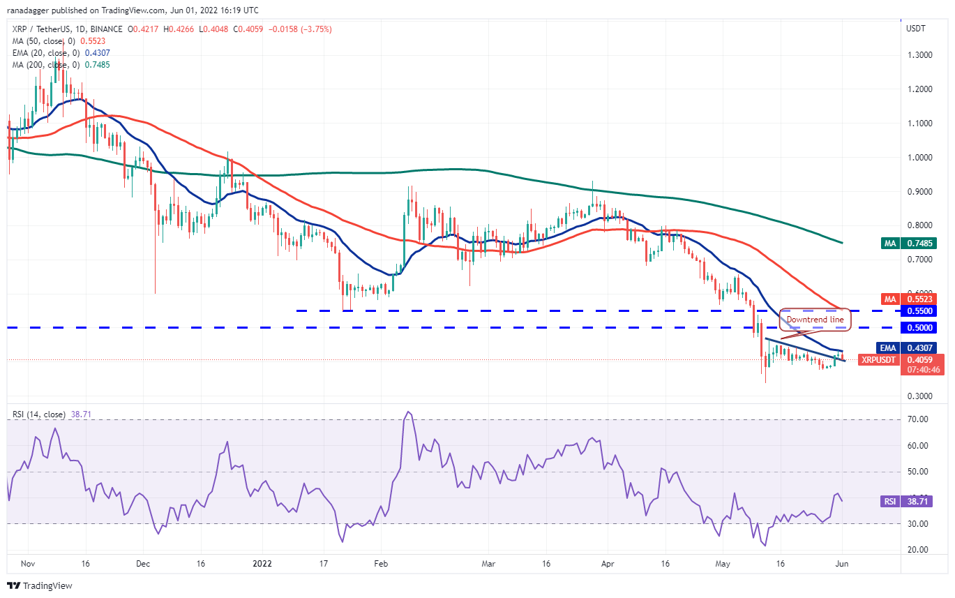 Ripple (XRP) rose above the downtrend line on May 30 but the bulls could not clear the overhead hurdle at the 20-day EMA ($0.43). This suggests that bears are not willing to surrender their advantage.