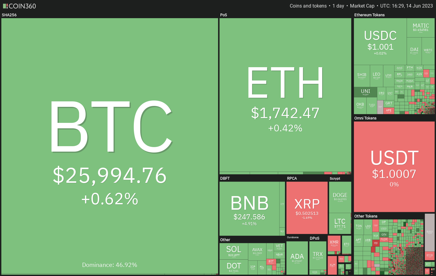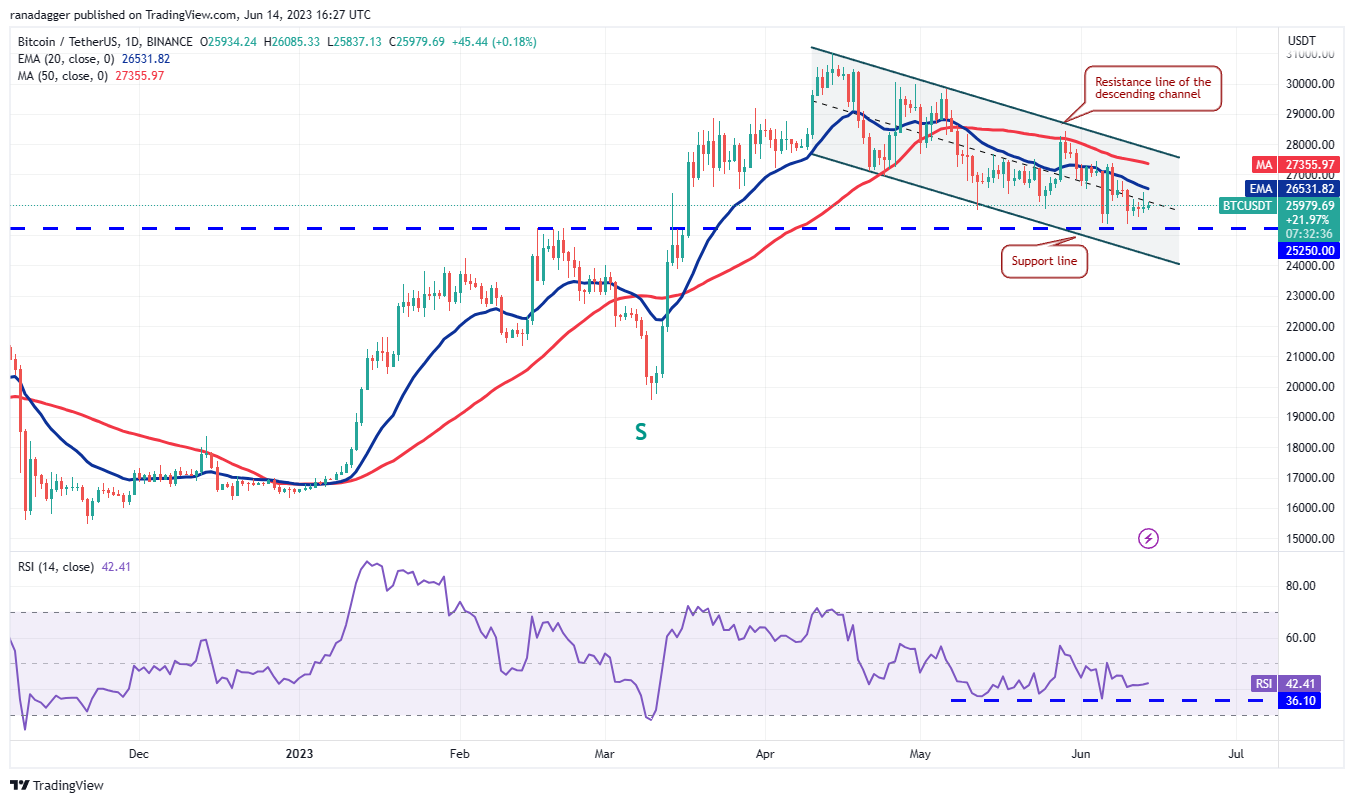 However, there is a ray of hope for the bulls because Bitcoin (BTC) is still holding above the $25,000 support. MicroStrategy co-founder Michael Saylor said in a Bloomberg interview on June 13 that the regulatory crackdown by the Securities and Exchange Commission may be bullish for Bitcoin. Saylor expects Bitcoin’s dominance to hit 80% in the future as “mega institutional money” flows into crypto after the “confusion and anxiety” dies down.