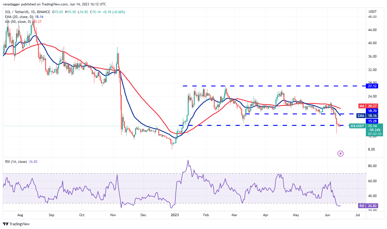 The bulls are struggling to sustain the price above $15.28, but they can take some minor solace in knowing that they have not allowed the SOL/USDT pair to remain below $15. The oversold levels on the RSI suggest that a relief rally is possible, but the bulls will have to overcome the barrier at $16.20. If they manage to do that, the pair may start an up move to the 20-day EMA ($18.16).
