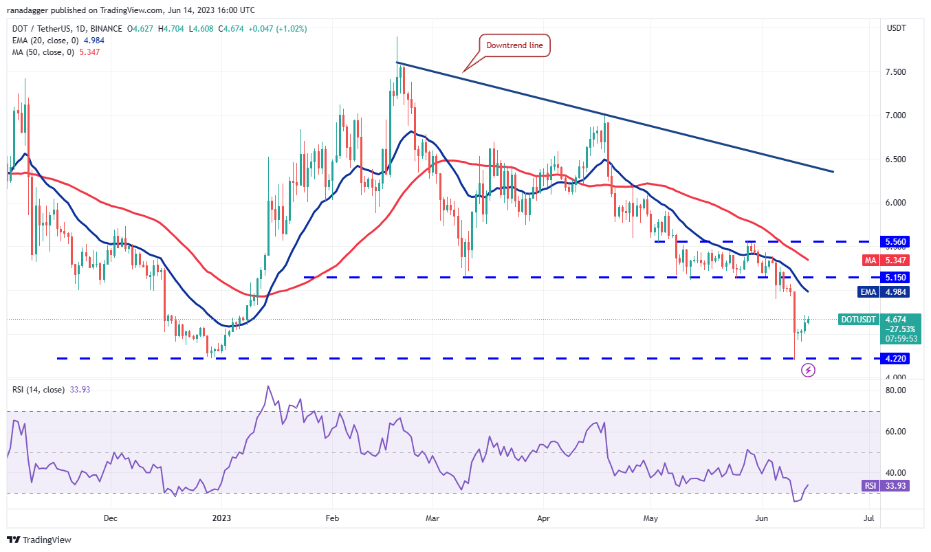Polkadot (DOT) rebounded off the strong support at $4.22 on June 10, indicating that the bulls are trying to arrest the decline.