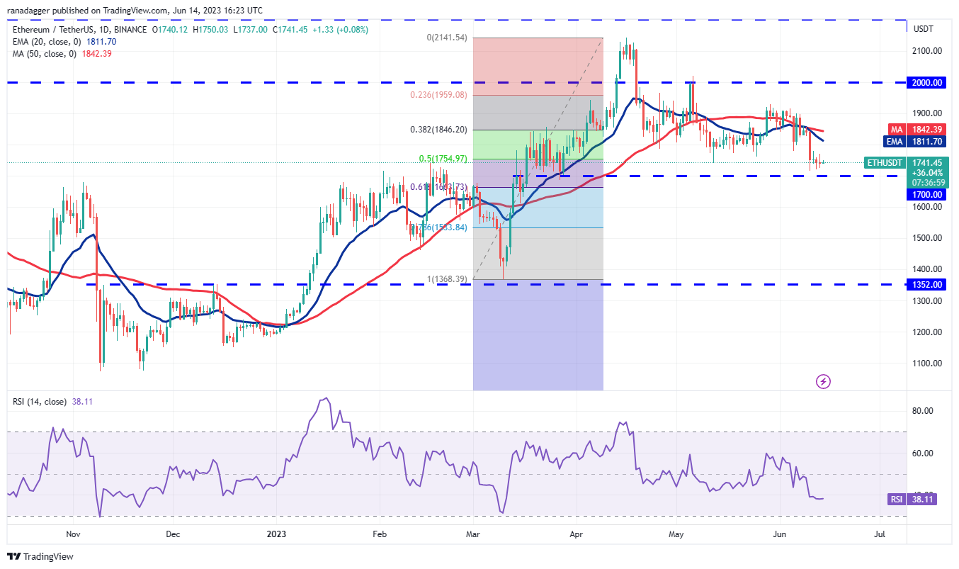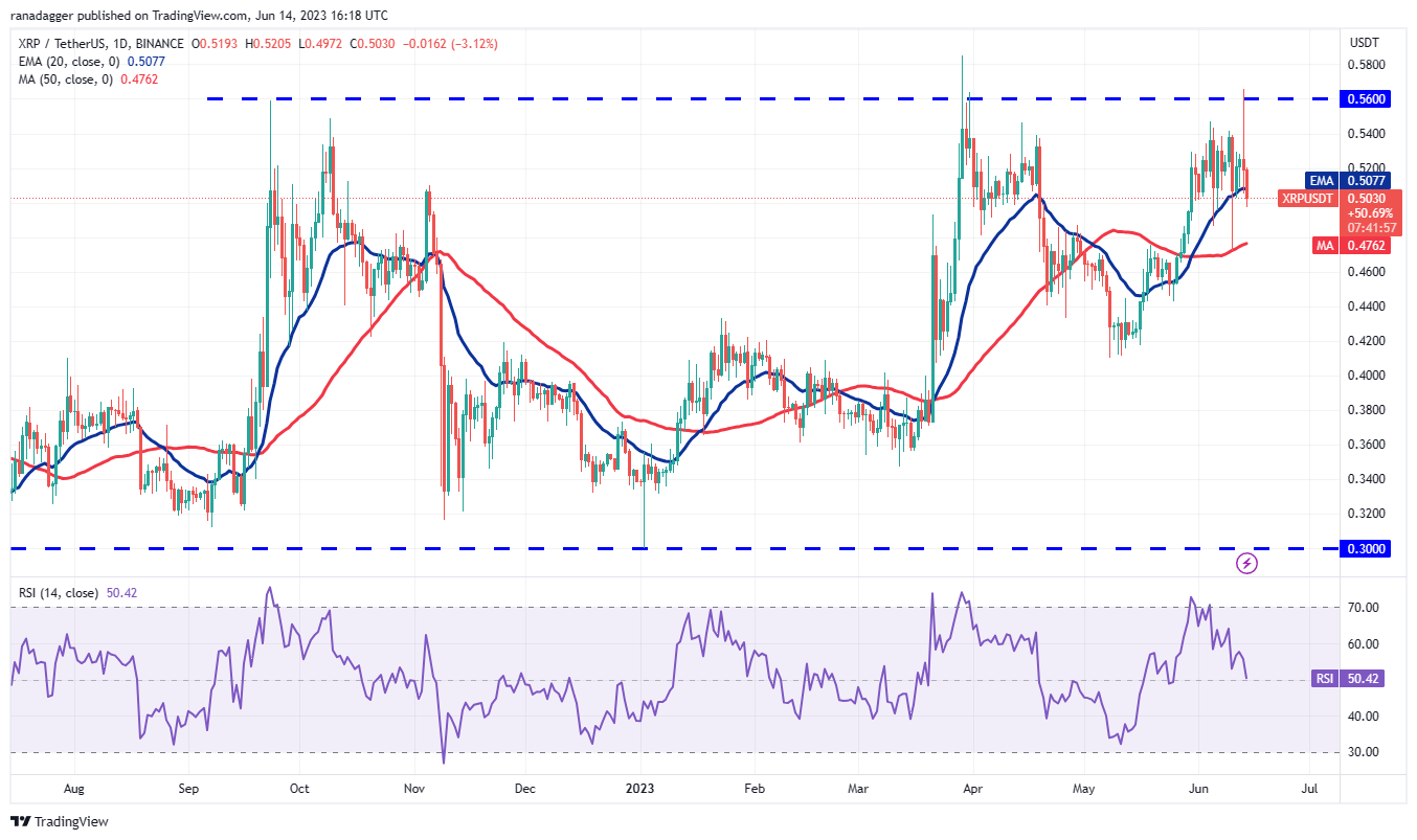 Bitcoin climbed close to the 20-day exponential moving average (EMA) of $26,531 on June 13, but the long wick on the candlestick shows that the bears sold at higher levels.