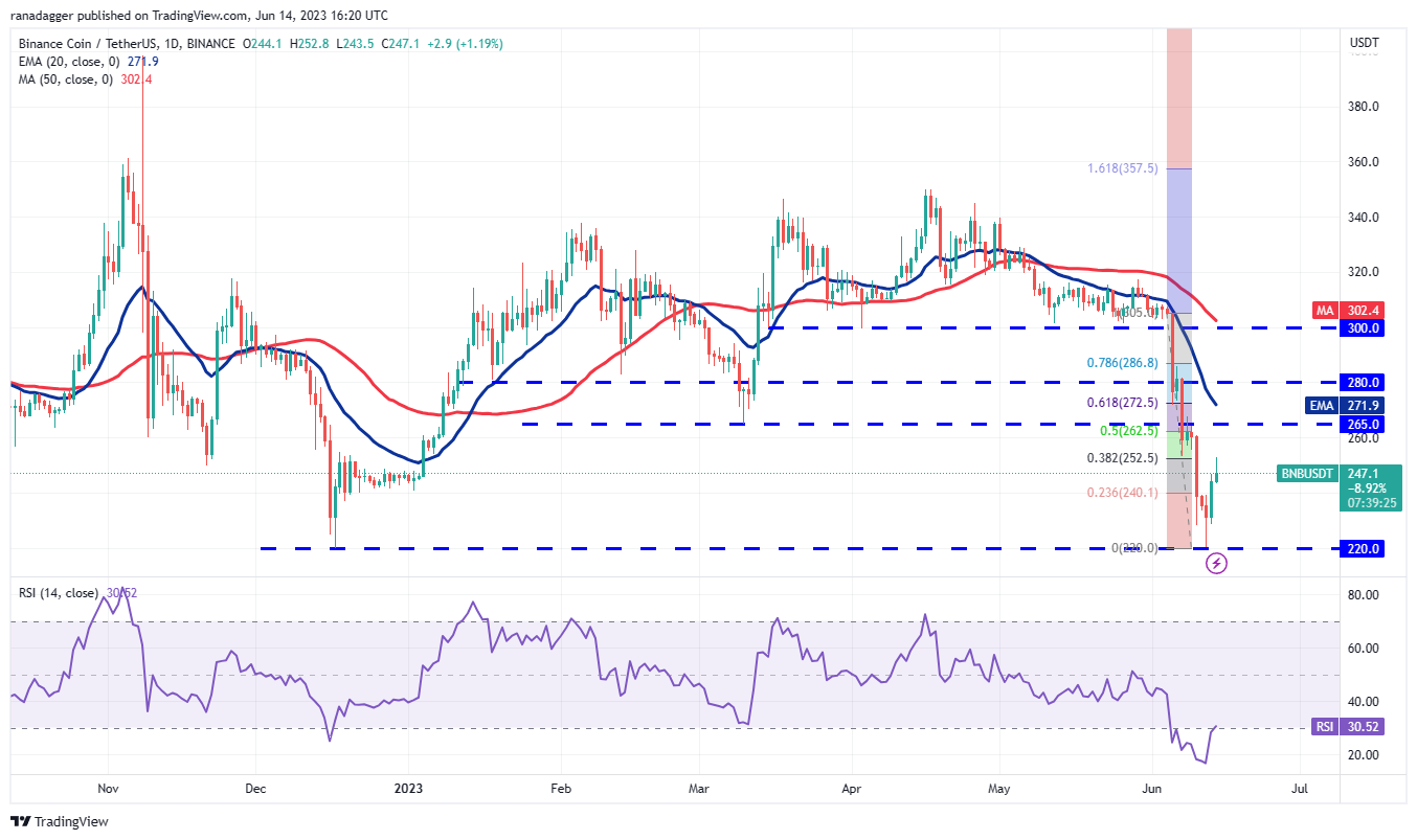 The BNB/USDT pair has started a recovery that is likely to face stiff resistance at the 38.2% Fibonacci retracement at $252 and again at the breakdown level of $265. If the price turns down from either level, it will suggest that the bears are viewing the relief rallies as a selling opportunity. The pair could then once again slide to $220.