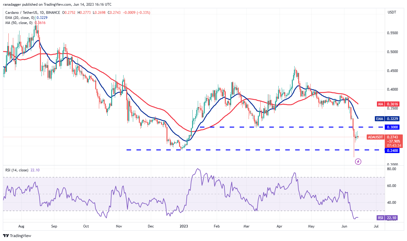 If buyers push the price above $0.30, it will suggest that the decline may have ended in the near term. The pair could then rise to the 20-day EMA ($0.32) and subsequently to the 50-day SMA ($0.36).