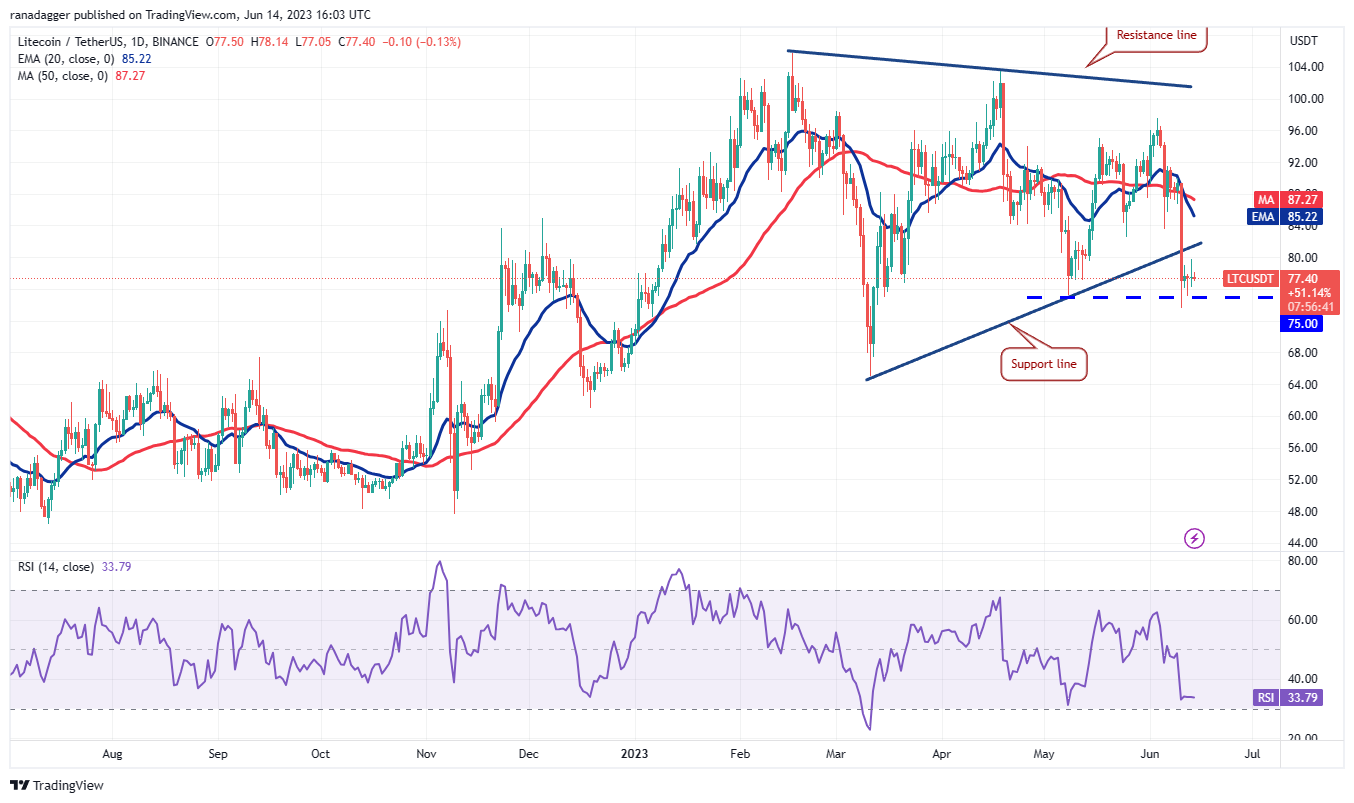 Litecoin (LTC) turned down from the moving averages and plummeted below the support line of the symmetrical triangle pattern on June 10, indicating that the bears overpowered the bulls.