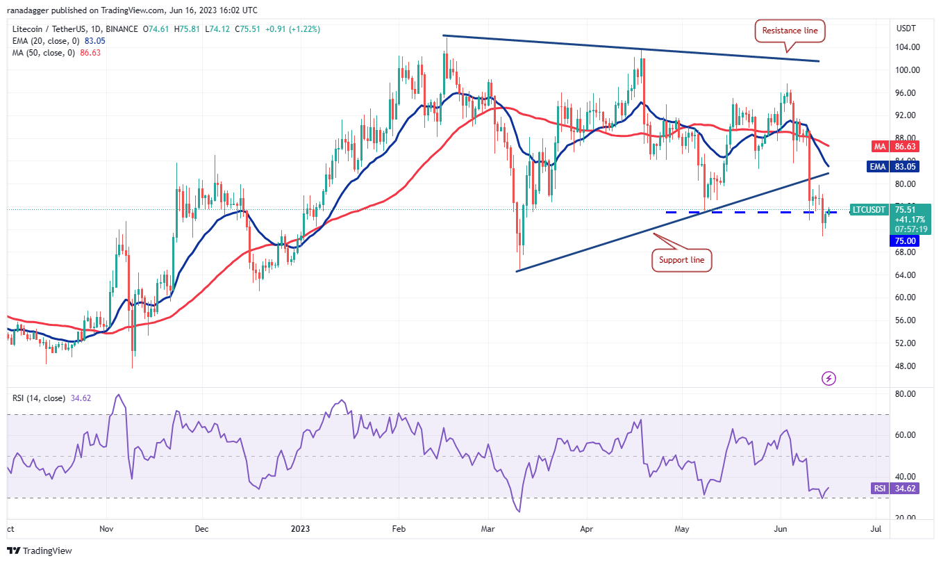 The $75 support cracked on June 14, indicating that the bears are trying to sink Litecoin (LTC) to the next support at $65.