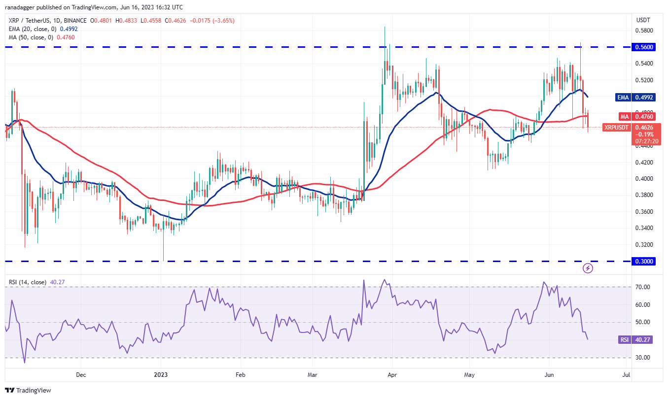 The price fell below the 50-day SMA ($0.47) on June 14 and 15 but did not close below the level. Buyers could not capitalize on this window of opportunity and push the price higher. That may have accelerated selling on June 16. If the price sustains below the 50-day SMA, the XRP/USDT pair could dive to $0.41.