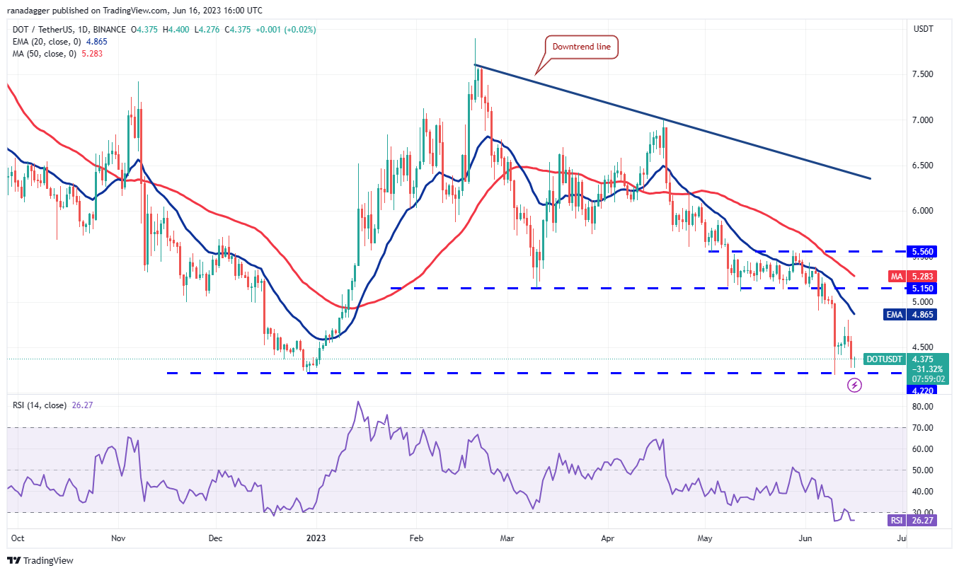 Polkadot (DOT) turned down from the 20-day EMA ($4.86) on June 14, indicating that the sentiment remains negative and bears are selling on rallies.