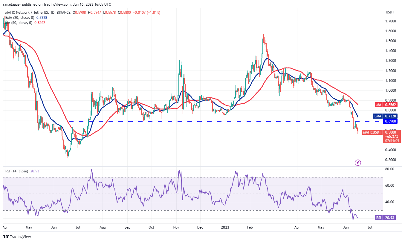 Polygon (MATIC) turned down from the breakdown level of $0.69 on June 13, indicating that the bears are trying to flip the level into resistance.