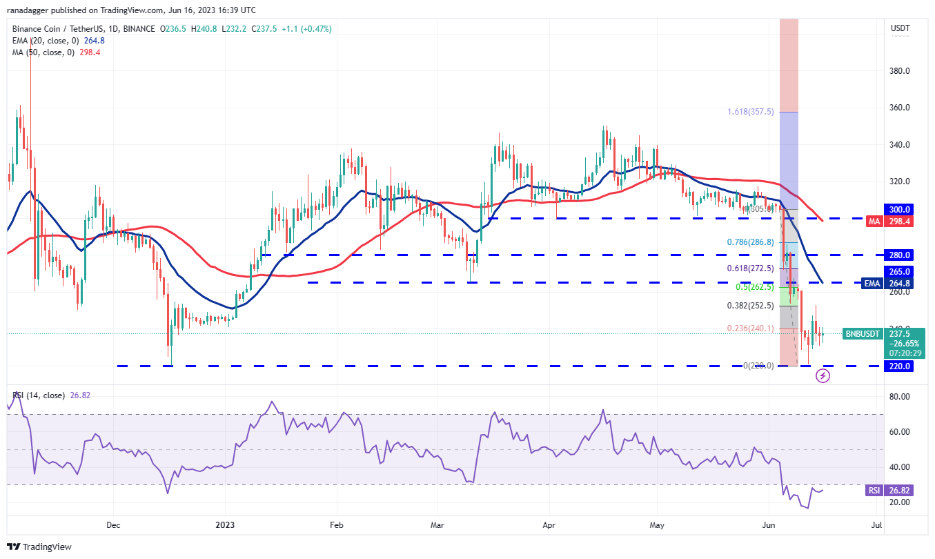 BNB’s (BNB) rebound fizzled out at the 38.2% Fibonacci retracement level of $252.50 on June 14, indicating that bears continue to sell on minor rallies.