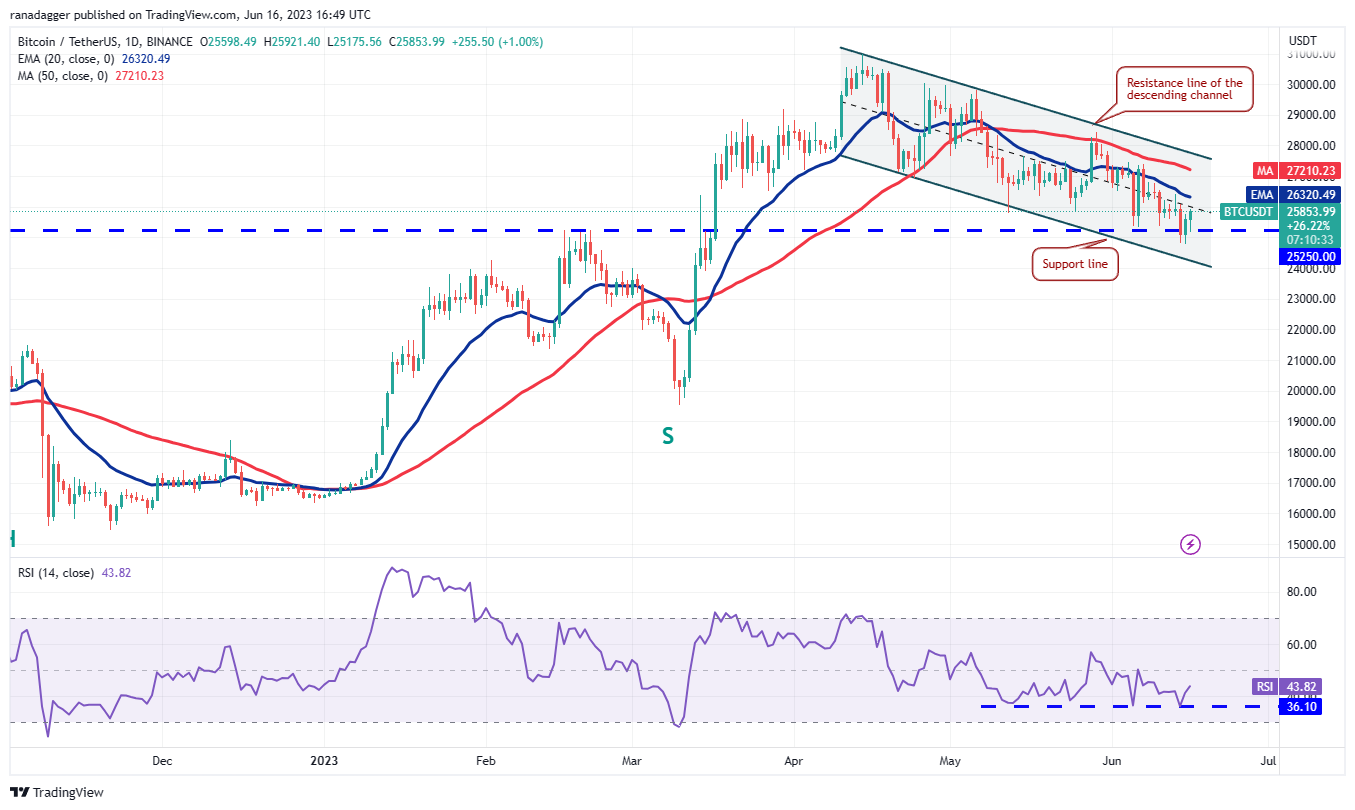 Although the bulls managed to push the price back above $25,250 on June 15, they will have to overcome the obstacle at the 20-day exponential moving average ($26,320) to start a meaningful bounce. The BTC/USDT pair could then attempt a rally to the 50-day simple moving average ($27,210) and subsequently to the resistance line of the descending channel.
