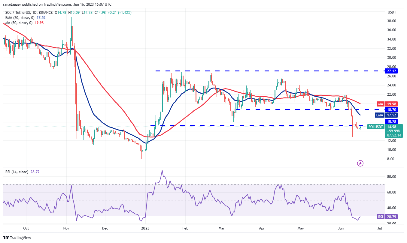 The failure of the bulls to push and sustain Solana (SOL) above the breakdown level of $15.28 attracted a fresh bout of selling on June 14.