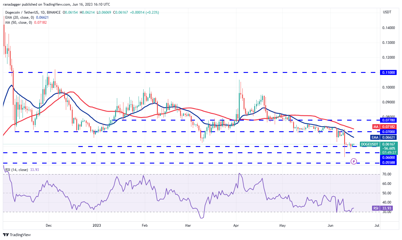 On the downside, the $0.06 level is an important support for the bulls to defend because if it gives way, the DOGE/USDT pair could plummet to the next support at $0.05. Conversely, a break above the 20-day EMA may result in a move higher to $0.08.