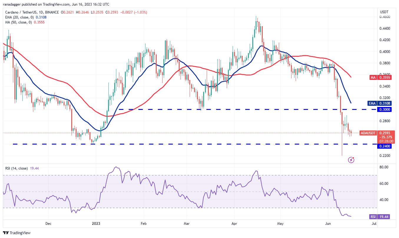 Cardano (ADA) turned down on June 14 but the bears are finding it difficult to sink the price to the next support at $0.24.