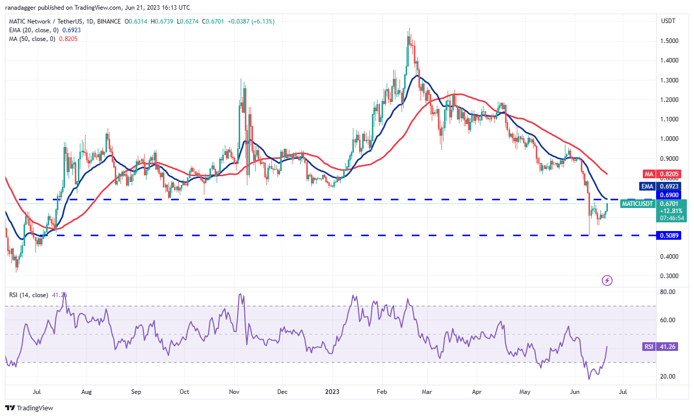 Polygon (MATIC) is gradually rising toward the breakdown level of $0.69. The 20-day EMA ($0.69) is also placed at this level, hence the bears are expected to defend this resistance with vigor.