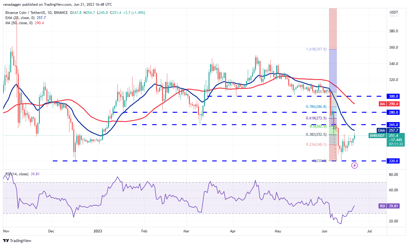 The wick on BNB’s (BNB) June 21 candlestick shows that the bears are selling the relief rallies to the 20-day EMA ($257).