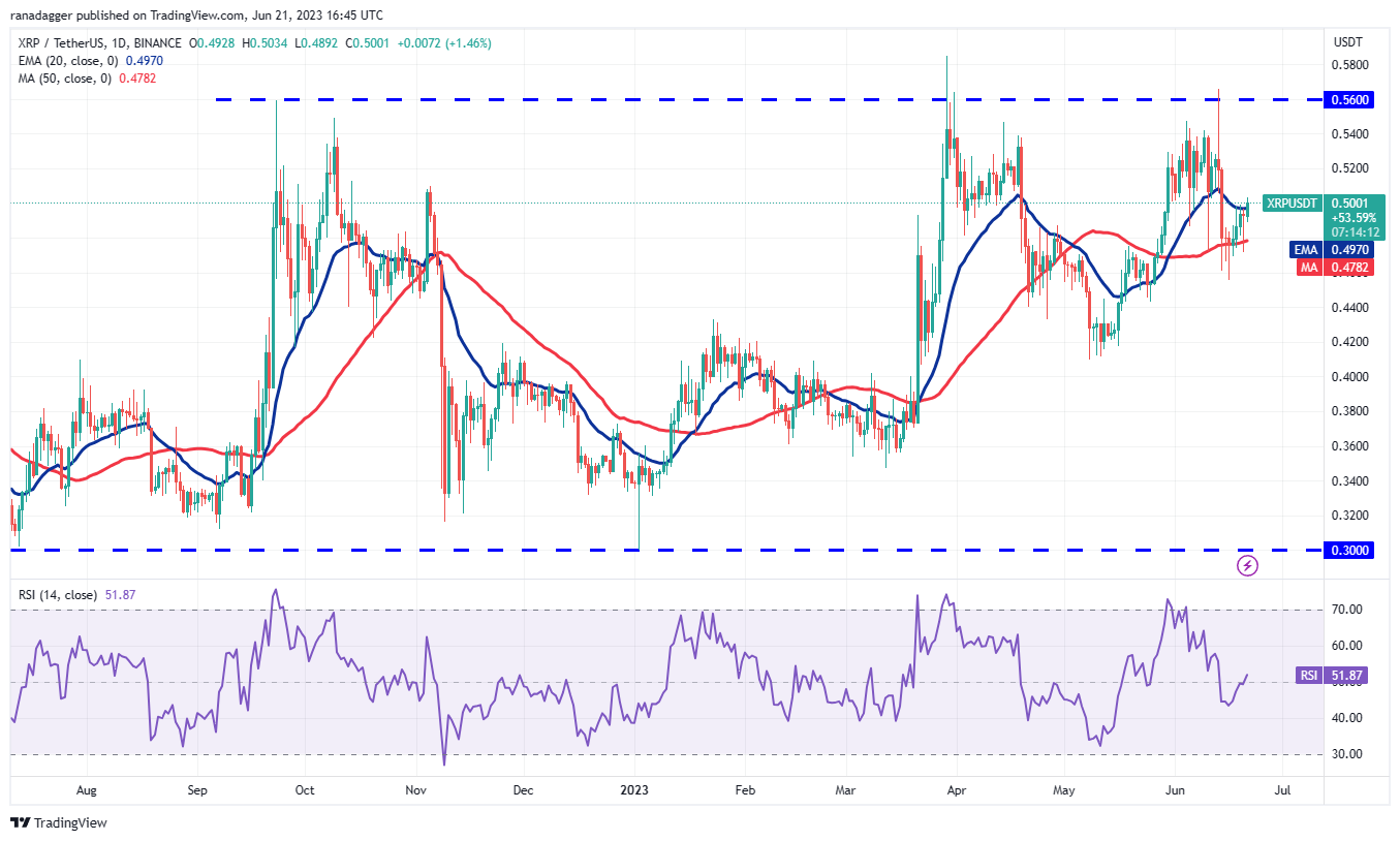 XRP (XRP) turned down sharply from the 20-day EMA ($0.49) on June 20 and slipped below the 50-day SMA ($0.47) but the long tail on the candlestick shows aggressive buying at lower levels.